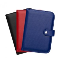 Descrição: Bloco de anotações em couro sintético com calculadora e caneta. Capa de couro sintético com frente e verso liso e trava de botão, possui calculadora solar plástica de 8 dígitos na parte interna, mini caneta plástica preta com acionador superior e destravamento lateral e bloco com aproximadamente 30 folhas brancas pautadas com verso liso.