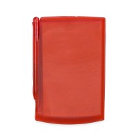 Descrição: Bloco de anotações plástico com autoadesivos e caneta.