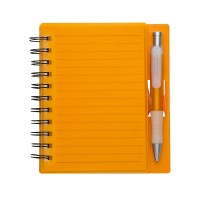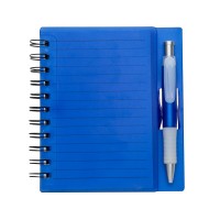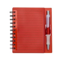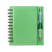 encaixe, bloco com wire-o e caneta plástica com detalhe
