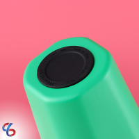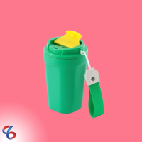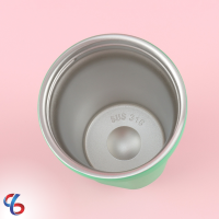 Copo térmico de inox 350ml com parede dupla, parte inferior com borracha antideslizante, tampa plástica rosqueável com abertura de bocal e alça de nylon para transporte com detalhe em couro sintético.
