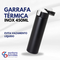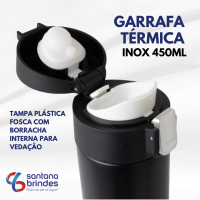 Garrafa Térmica 450 ml em inox com sistema de trava. Contém acabamento fosco e revestimento interno em inox, possui tampa plástica fosca com borracha interna para vedação, evitando o vazamento de líquido, botão central para abertura e trava lateral (basta seguir a orientação dos desenhos de cadeados, simulando o travamento/destravamento da tampa).