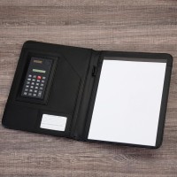Descrição: Pasta convenção de couro sintético, possui calculadora solar