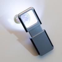 Descrição: Lupa plástica com lanterna e destalhes emborrachados com relevo