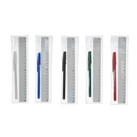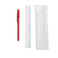 Descrição: Kit régua e caneta plástica em estojo plástico transparente.