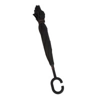 Descrição: Guarda-chuva invertido com forro interno. Tecido de nylon impermeável preto, possui um mecanismo inovador permitindo que o usuário não se molhe ao entrar e sair de ambientes devido sua abertura invertida, quando feito o movimento para fechar as varetas inverterão para cima criando um formato circular impedindo a chuva de atingir o usuário, podendo “segurar” a chuva enquanto entra/sai de um ambiente e depois virando o guarda-chuva irá escorrer a água. Forro interno para preservação das 8 varetas, evitando contato com a água e assim prolongando seu tempo de uso sem enferrujar. Ao impulsionar o fechamento invertido fica mais rápido e prático o modo de secar e ser guardado, pode ser apoiado no chão que permanecerá em pé para escorrer a água. Pegador plástico fosco em formato C, botão acionador vermelho e fita com velcro(contorno marrom) para lacre.