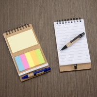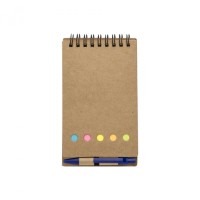 Descrição: Bloco de anotações ecológico com autoadesivos e mini caneta. Bloco com wire-o e detalhes vazados na capa, contém conjunto de cinco bloquinhos autoadesivos coloridos, bloco autoadesivo pequeno, miolo com folhas pautadas e suporte de nylon com mini caneta de papelão com carga esferográfica na cor azul e acionamento por clique..