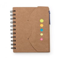 Descrição: Bloco de anotações ecológico com caneta e autoadesivos. Bloco com fechamento lateral tipo “envelope e com espiral preto lateral. Possui cinco furos na capa referente aos blocos autoadesivos internos com 25 folhas cada, bloco com aproximadamente 70 folhas brancas pautadas e caneta de papelão de clip e ponteira plástica. OBS.: PEDIDO MÍNIMO DE 25 PEÇAS!