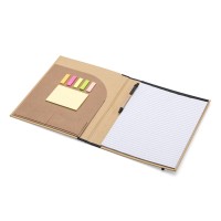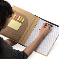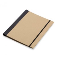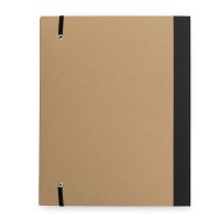 Descrição: Pasta convenção ecológica, modelo kraft. Frente e verso da capa lisos com uma faixa preta na lateral, possui elástico preto para fechar a pasta. Há um “bolso” interno grande com cinco blocos autoadesivos coloridos com aproximadamente 25 folhas, bloco amarelo com aproximadamente 25 folhas, dois suporte porta cartão, suporte e caneta de papelão(clip plástico) e bloco com aproximadamente 25 folhas pautadas com verso liso(tamanho A4).