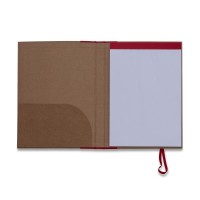 elástico para fechar a pasta. Há um “bolso” interno no verso da capa e bloco com